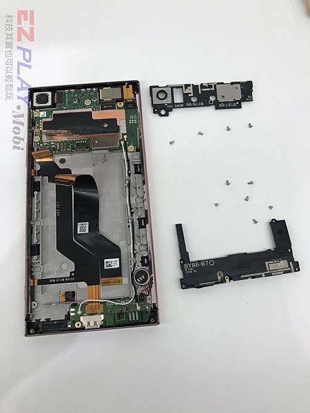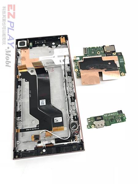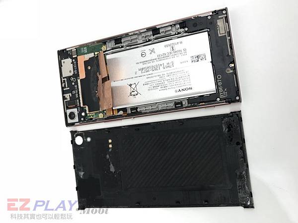 首先我們先加熱把黏得很緊的SONY XA1 ULTRA 背蓋 給拆解開,此時看到內部構造,SONY的螺絲非常之多。