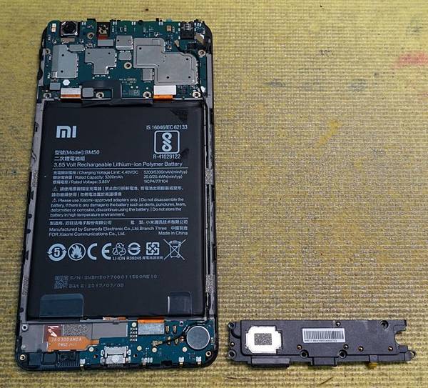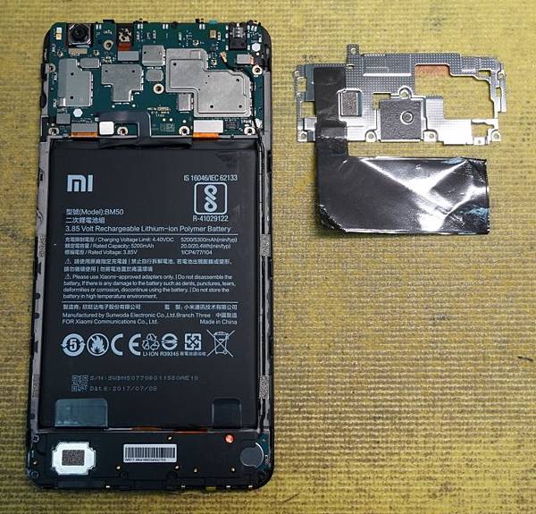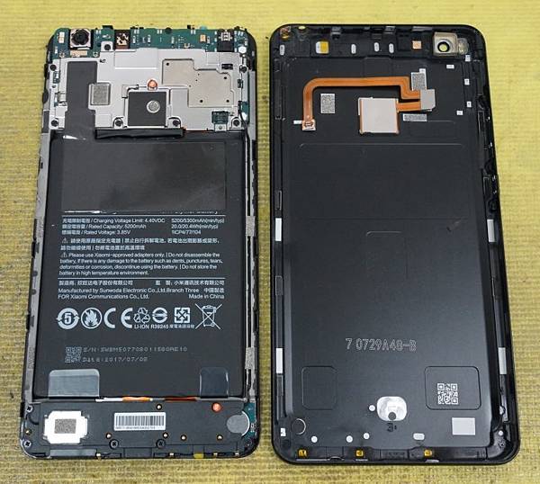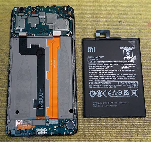 取下手機電池即可以看到隱藏在電池下方的兩條排線,分別是面板控制排線及充電模組控制排線,小米 Max2 手機電池容量有 5200mAh 超大顆的電池,比一般平板電池還要大顆果然超划算。