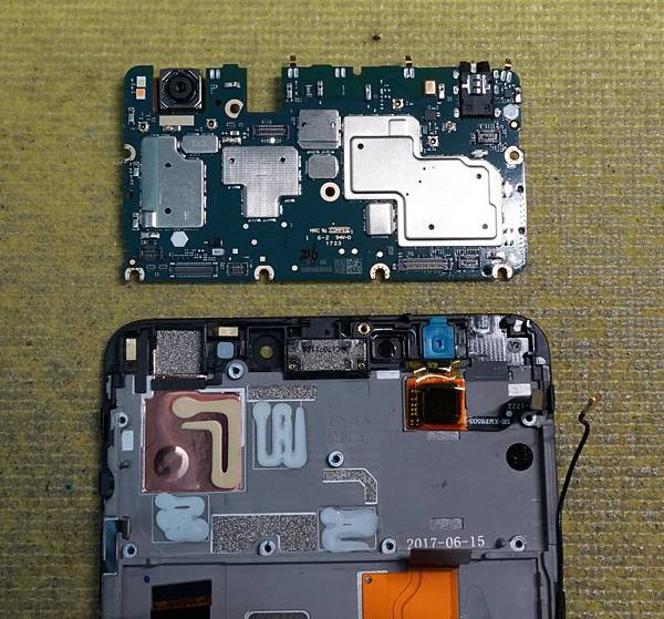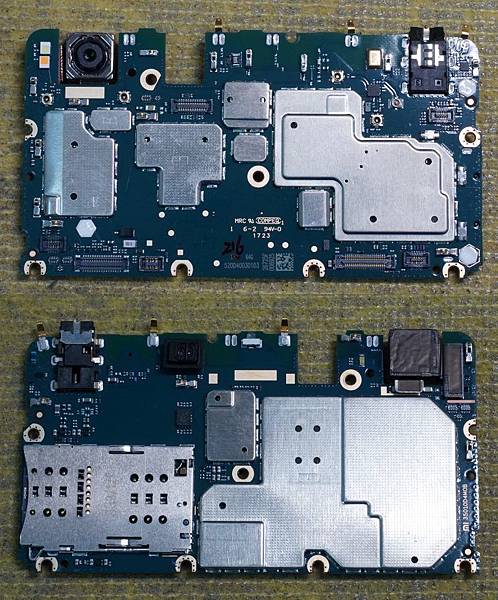 主機板卸下後,正面及反面的線路就可以一覽無遺,主要的功能IC都被隔離罩保護起來,機板正面線路分別有五個排線連接座,由左至右分別是音量及開機排線座、面板排線座、電池座、充電模組排線座及指紋排線座,機板反面線路的左下角即為SIM卡及SD 卡座。