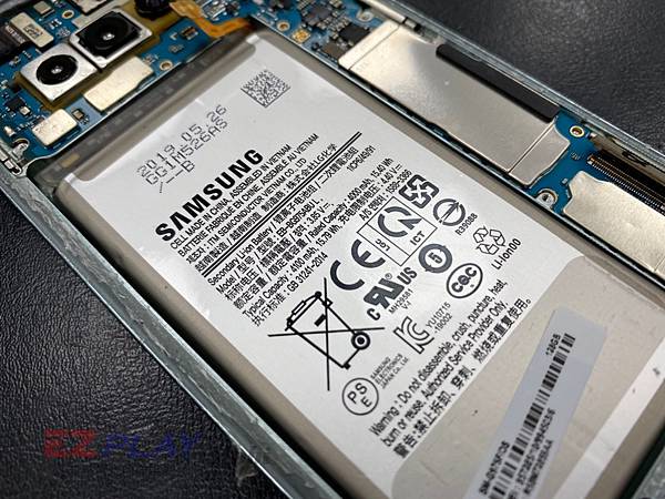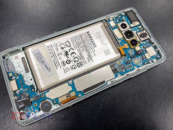 拆除SAMSUNG Galaxy S10+的上蓋後,可以看見主機板與電池的簡潔有力的構造。